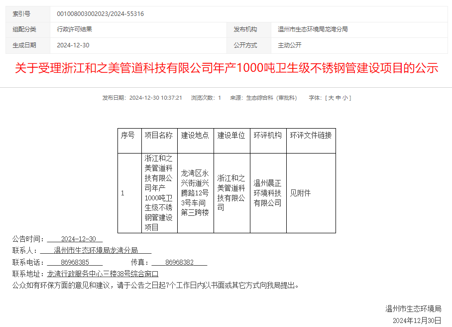 2024年12月30日溫州市生態環境局龍灣分局受理浙江和之美管道科技有限公司年產1000噸衛生級不銹鋼管建設項目環境影響評價報告表并對外進行公示,公示期:7個工作日。