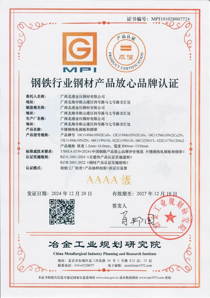 近日,北港新材料公司熱軋、冷軋鋼板和鋼帶榮獲冶金工業規劃院“AAAA”級放心品牌產品認證,進一步提升北港新材料公司不銹鋼品牌的附加值和軟實力。