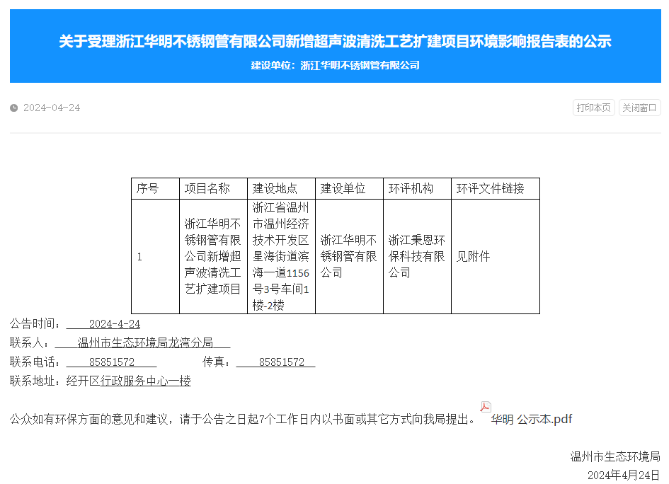4月24日,溫州市生態環境局受理浙江華明不銹鋼管有限公司新增超聲波清洗工藝擴建項目環境影響報告表并對外進行公示,公示期:7個工作日。